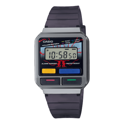 Stranger Things Casio A120WEST-1A, là hình ảnh đại diện của tính thẩm mỹ này. Đó là một chiếc đồng hồ A120 tiêu chuẩn - chiếc đồng hồ cổ điển có bốn nút vui nhộn bên dưới một màn hình LCD nhỏ - nhưng có màu sắc phong cách Stranger Things rõ ràng. Toàn bộ thiết bị có nhiều thiết kế lộn ngược, từ các đường gân trên mặt và dây đeo, đến Demogorgon bên dưới phần chữ và khi bạn bật sáng đèn, bạn sẽ thấy logo Stranger Things nhỏ lộn ngược xuống hiện ra.