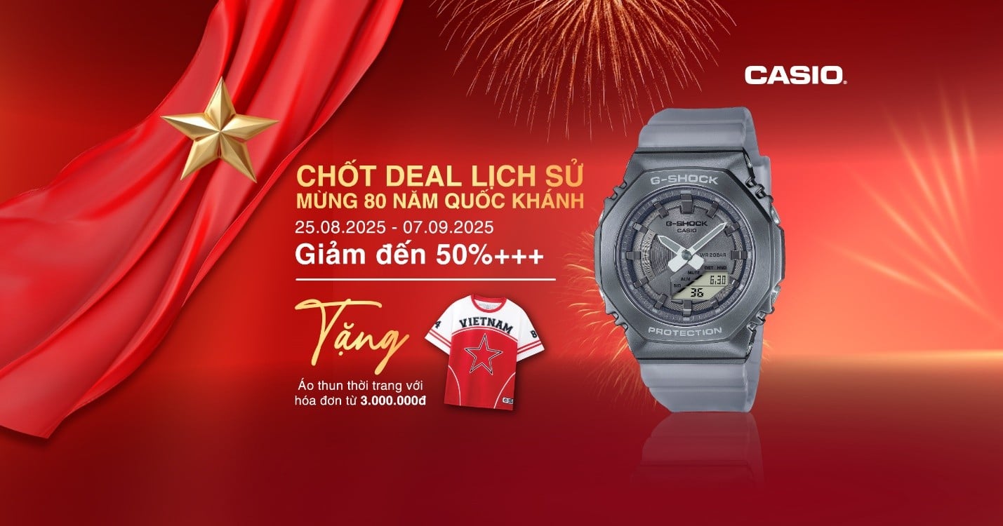 Tròn 80 năm ngày Quốc Khánh, khoảnh khắc trọng đại của dân tộc Việt Nam, Casio Anh Khuê Watch gửi đến bạn chương trình khuyến mãi lớn nhất năm. Đây là dịp tuyệt vời để sở hữu đồng hồ chính hãng với giá siêu ưu đãi cùng loạt quà tặng đặc biệt.
